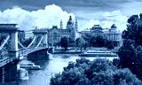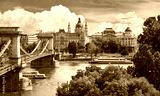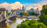 Panoramic view at Chain bridge on Danube river in Budapest city, Hungary. Urban landscape panorama with old buildings and domes of opera budapest