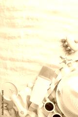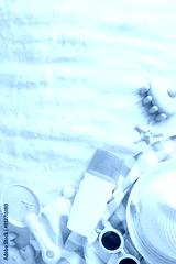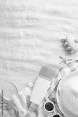 Top vertical view of a sandy beach setup featuring children's toys, sunscreen, a straw hat, and sunglasses for a family vacation