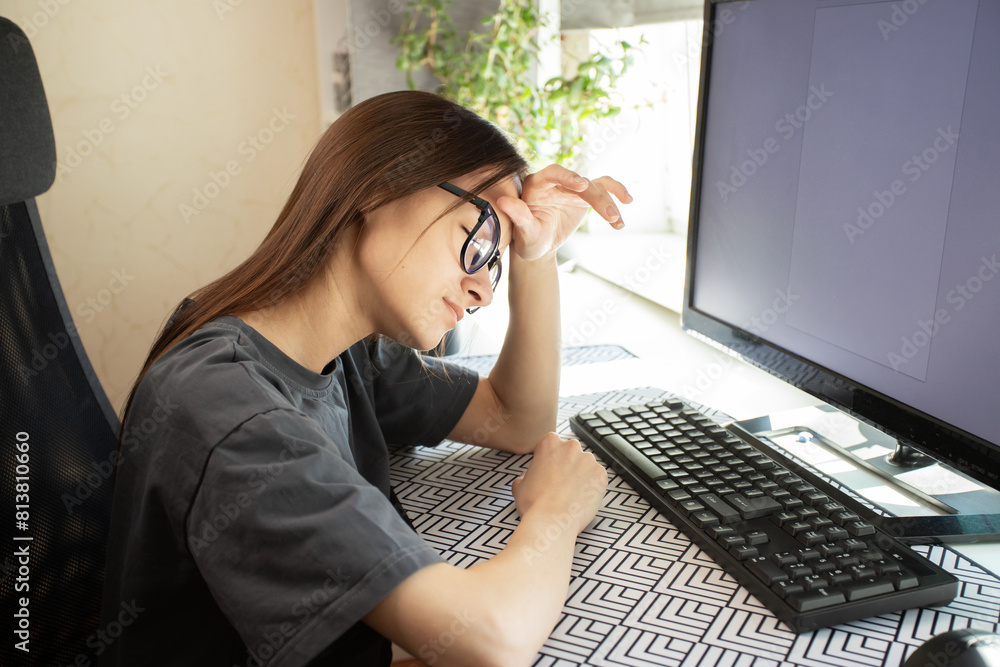 Teenager has headache, tired from study, slouched at desk with textbooks open