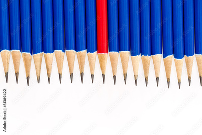A red pencil among blue pencils, difference and standing out