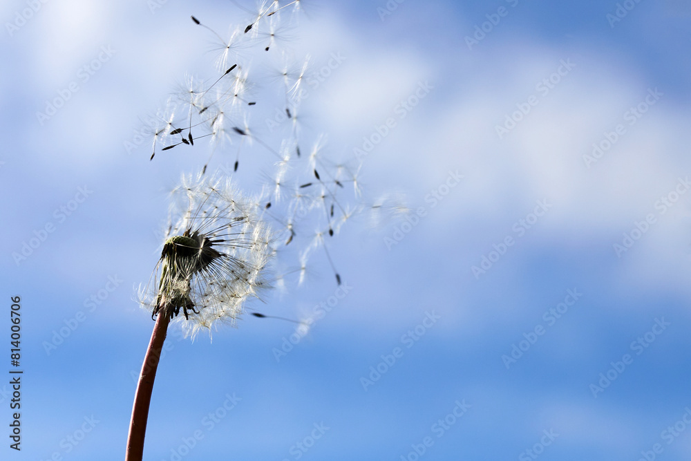 National Asthma and Allergy Awareness Month. Fluffy dandelions glow in rays of sunlight at sunset