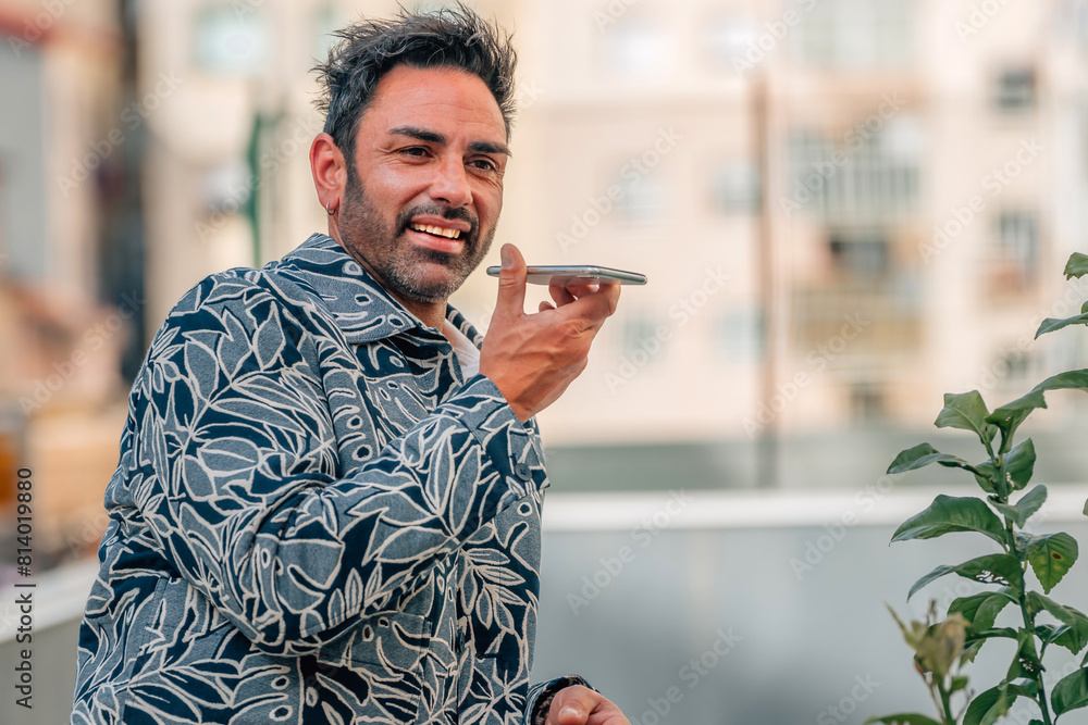 attractive dark latin model with mobile phone sending voice message or recording audio