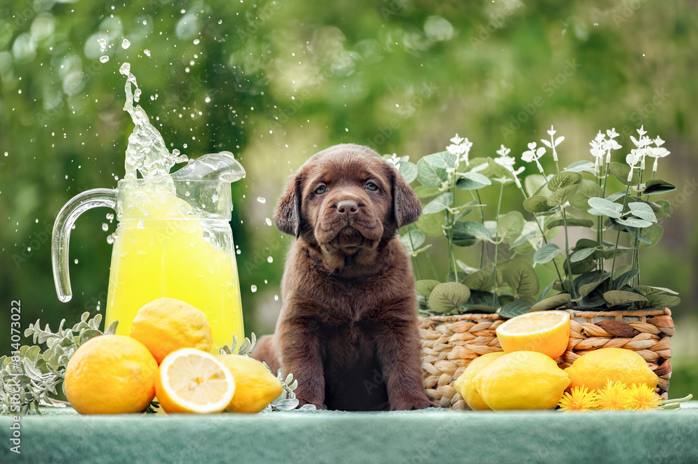 chocolate labrador puppy posing with lemons and frech juice outdoors in summer
