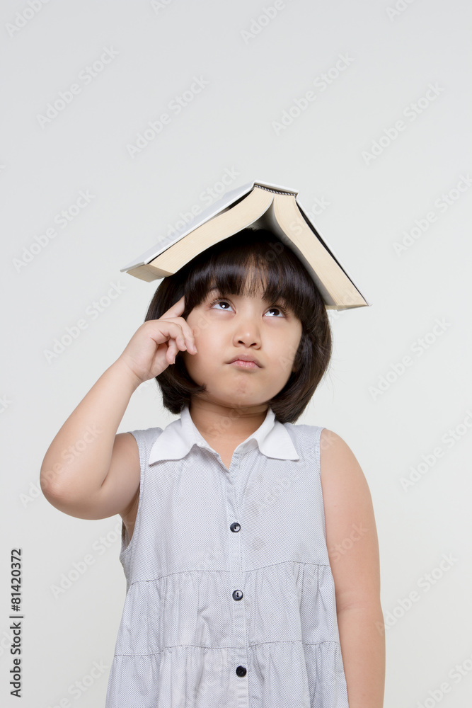 Portrait of little Asian child thinking and put a book on top