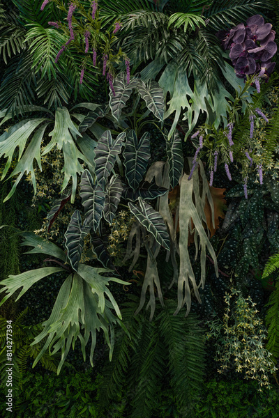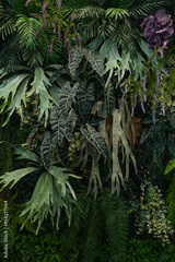 Tropical green leaves background, Nature Wall Lush Foliage Leaf Texture, Vertical image.