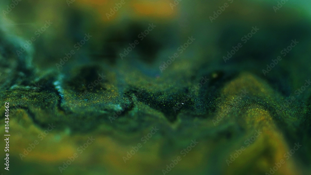 Blur marble texture. Glitter paint flow. Defocused green gold yellow black color shimmering ink mix flow abstract art background.