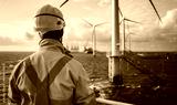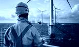 A professional shot of a worker in safety gear observing offshore wind turbines from a platform