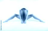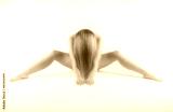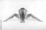 Frau nackt sitzt auf dem Boden nach vorne gebeugt