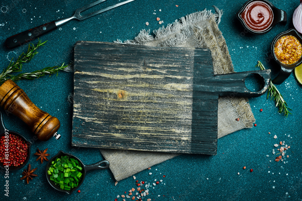 Kitchen cutting board on table with spices, vegetables and herbs. Free space for a recipe. Rustic style. On a dark background.