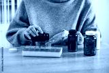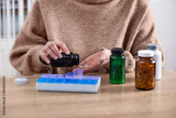 Female putting prescription pills and vitamins in a daily pill box organizer. Sorting nutritional supplements and antibiotics into weekly pills container.