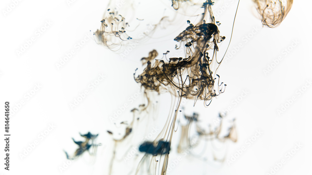 Black ink swirls forming delicate patterns as they diffuse elegantly through clear water, resembling an abstract ballet.