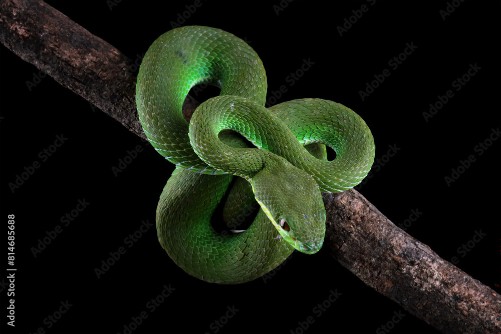 baby green viper snake isolated on black background, trimeresurus albolabris