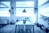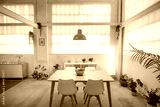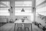 Interior design of a industrial loft dinning room, table, and chairs in a living room. High quality photo