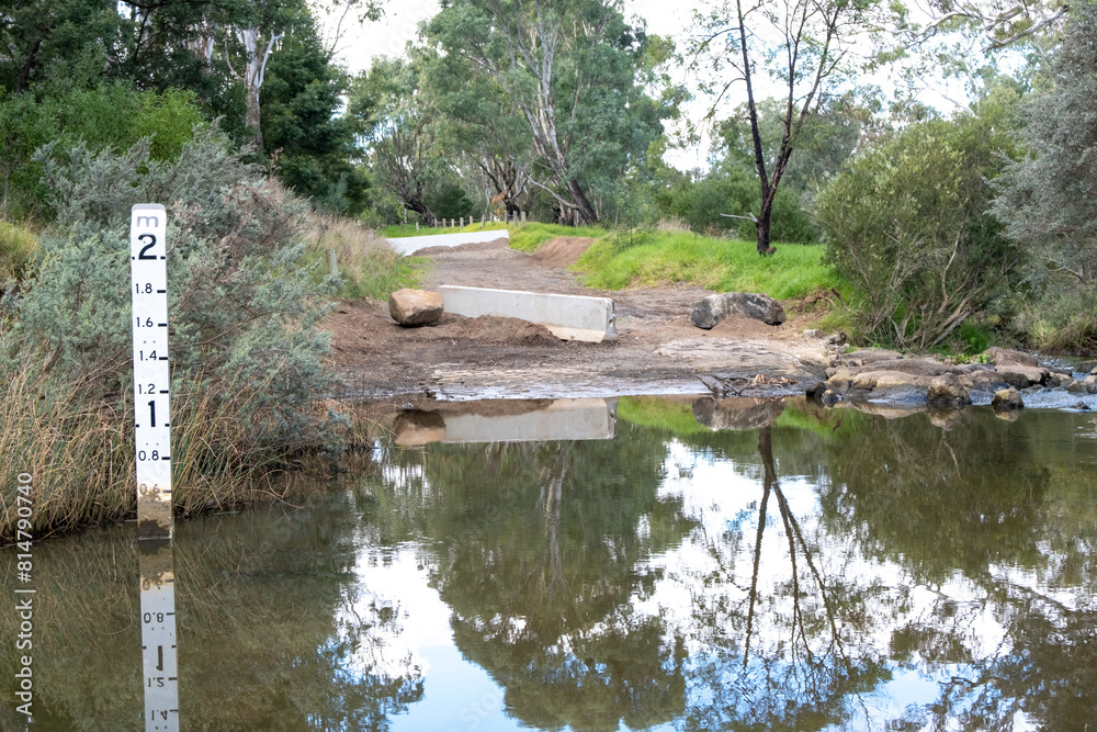 A closed and flooded dirt road with a depth indicator or Flood Depth Marker Sign with increments up to 2 meters to show the water level at a river crossing in rural Australia. Mount Cottrell VIC