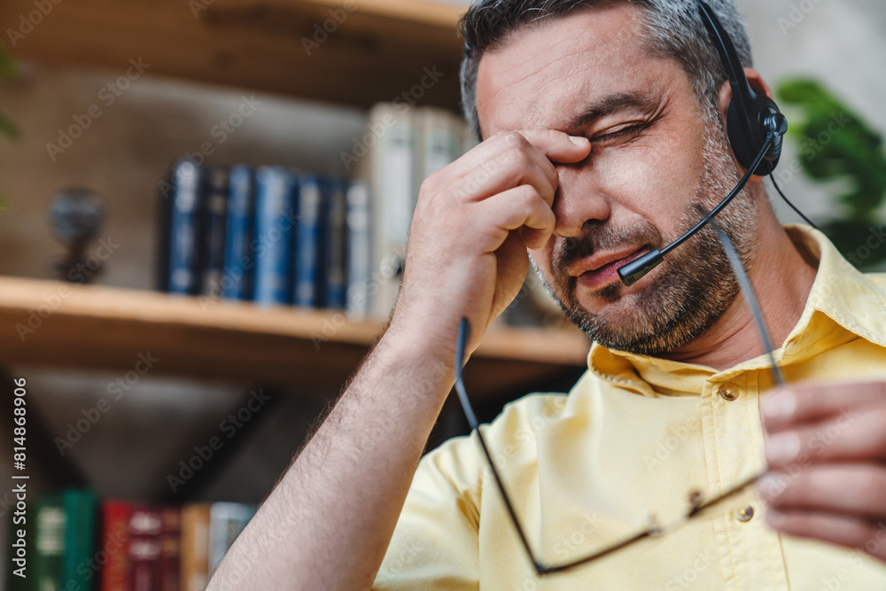 Close up of call center operator wearing headset tired at home office. Handsome middle age man agent touch head for pain in head because stress. suffering migraine.