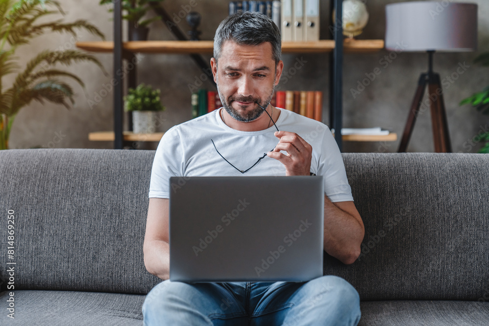 Adult man freelancer working with laptop, chatting, using social media, browsing, doing online shopping, have zoom video call, reading news while sitting on couch sofa at home