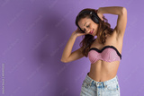 Beautiful young curly woman with headphones against purple backg
