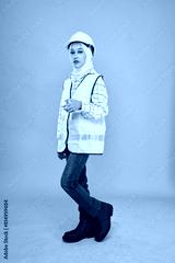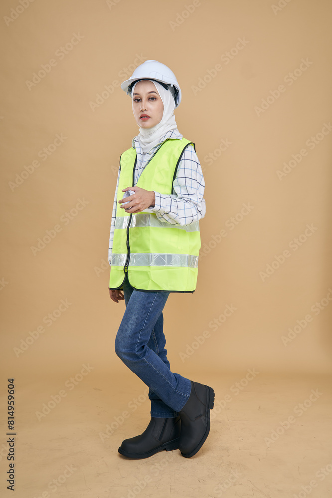 Asian hijab girl engineer in yellow safety vest, wearing a safety helmet and holding blueprint drawing isolated on background in studio.