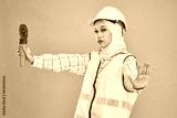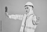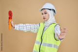 Female Asian site worker holding a safety cone hazard light isolated over studio background. Hijab girl working and wearing safety uniform, helmet in industry factory