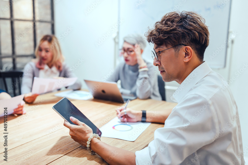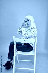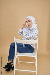 Portrait of an Asian model in white shirt and blue jeans with hijab sitting on a white chair isolated over beige background. Stylish Muslim female hijab fashion lifestyle concept.