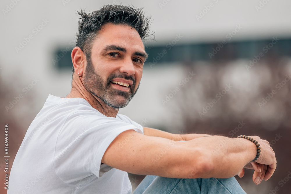 portrait of attractive middle aged man with beard outdoors