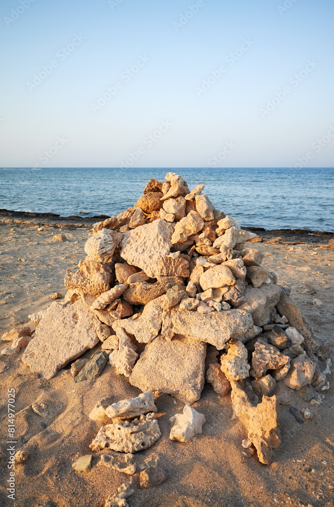 Pyramid of coral and stones on the beach, selective focus, Egypt.