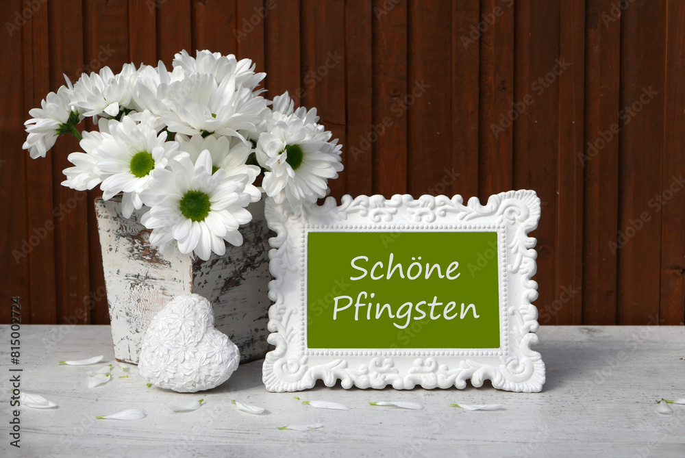 Grußkarte Schöne Pfingsten: Blumenarrangement mit dem Text Schöne Pfingsten.