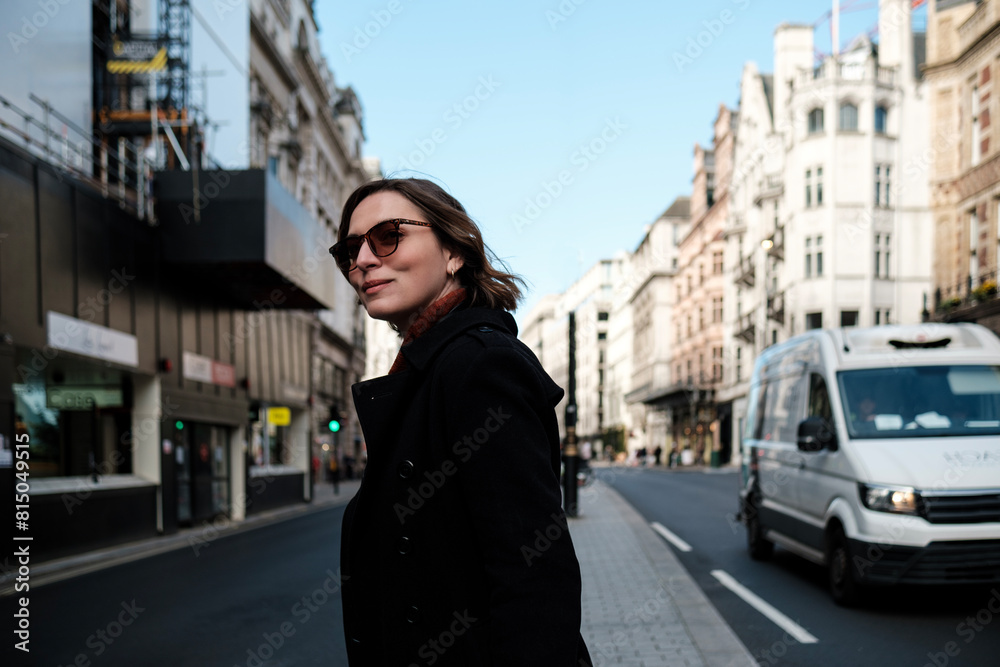 Woman wearing black coat and sunglasses standing in the middle of the street.