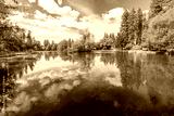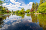 The landscaped gardens surrounding Mirror Pond at the public Manito Park and Botanical Gardens in the South Hill downtown district of Spokane, Washington.