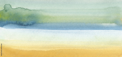 Ink watercolor hand drawn smoke flow stain painting blot landscape on wet paper texture horizontal long background.
