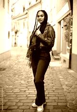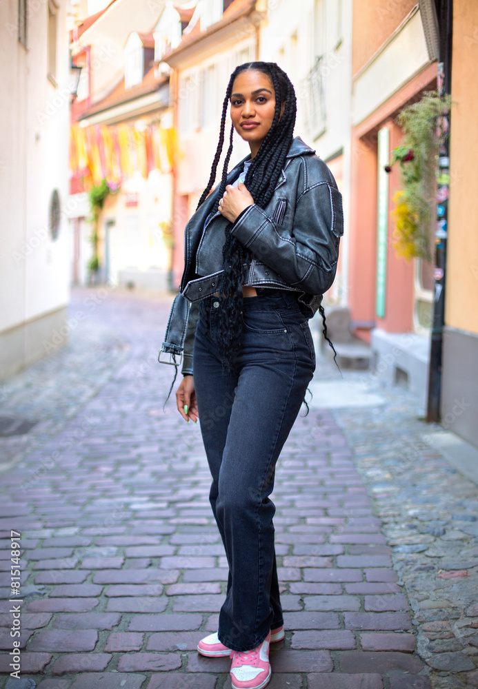 stylish young black female with afro braids a leather jacket is staying on the narrow street