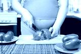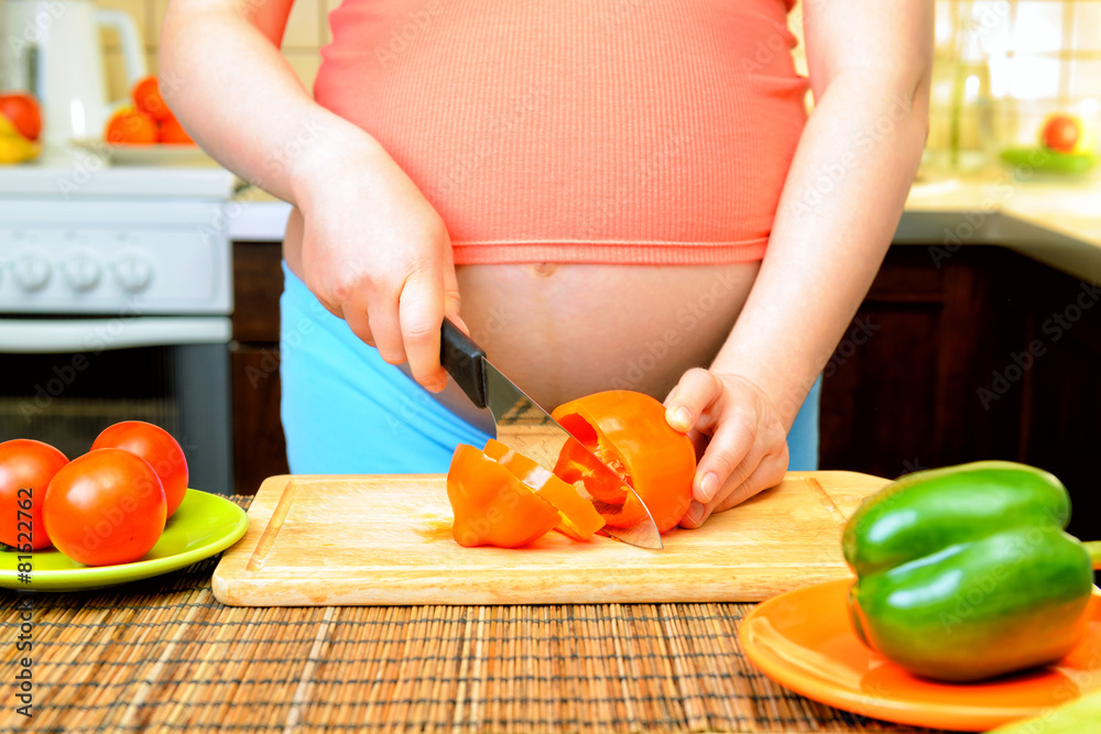 Pregnant woman cooking food in kitchen, healthy eating concept