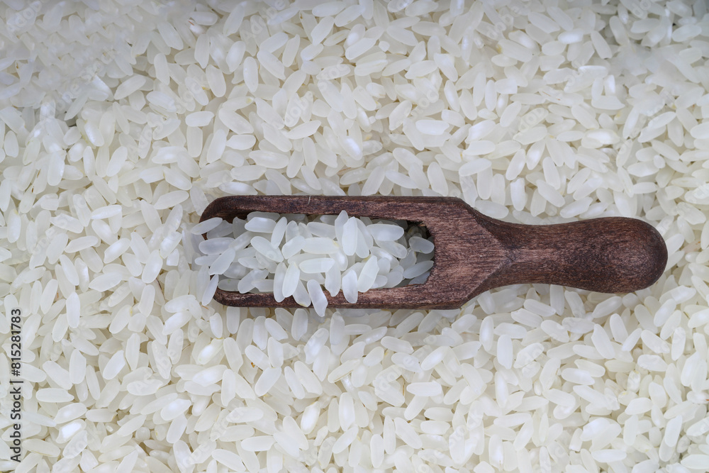 Raw white rice on black background. Long uncooked rice in wooden plate. Natural organic food. Traditional Asian cereal culture.