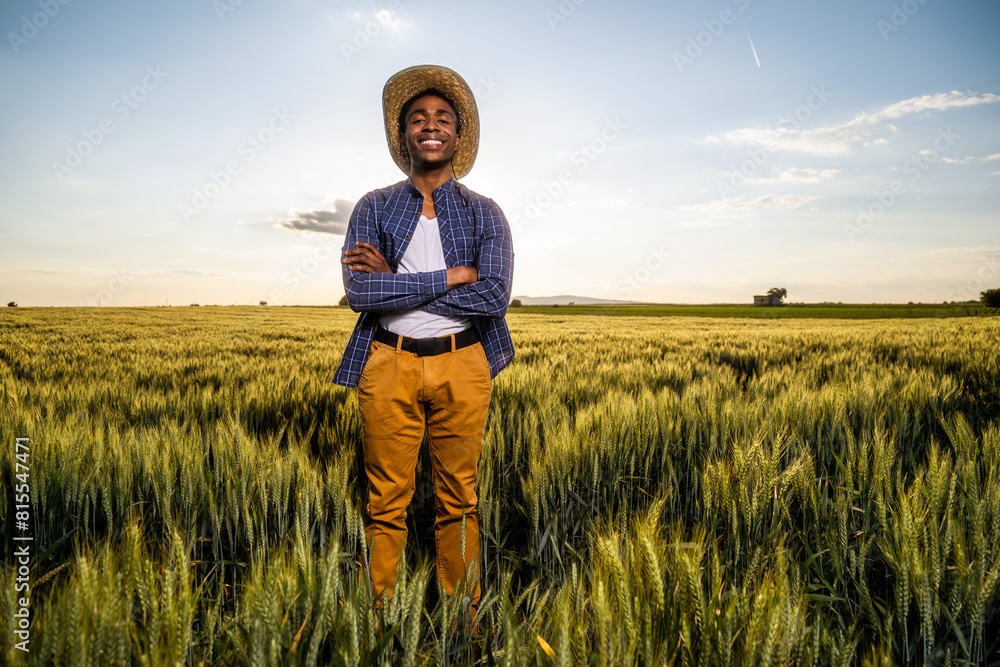 African farmer is standing in his growing wheat field. He is satisfied with progress of plants.