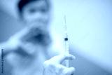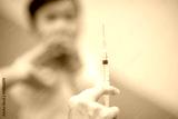 pediatrician Hand hold vaccine liquid injection in syringe for injecting child baby infant. small syringe needle for infant prevention flu by vaccination immunity in Pediatrics hospital clinic.