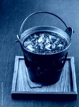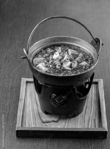 A photo of Mapo Tofu in a metal bowl on a wooden plate.
