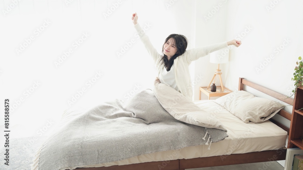 目覚めて伸びをする女性