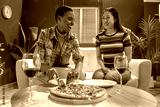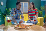 Two female friends celebrating with pizza and wine having fun together at home. High quality photo