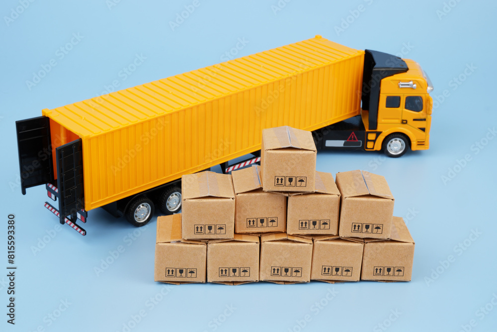 Yellow truck and many shipping carton boxes on blue background. Transportation, delivery and cargo concept.