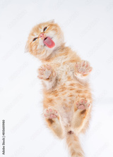 bottom view through transparent glass of a cute ginger tabby scottish fold kitten licking glass table. Isolated on white background