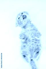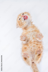bottom view through transparent glass of a cute ginger tabby scottish fold kitten licking glass table. Isolated on white background