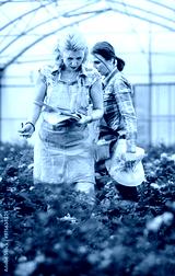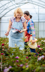 Two women working in the flower greenhouse selecting roses for pollination to create a new variety.