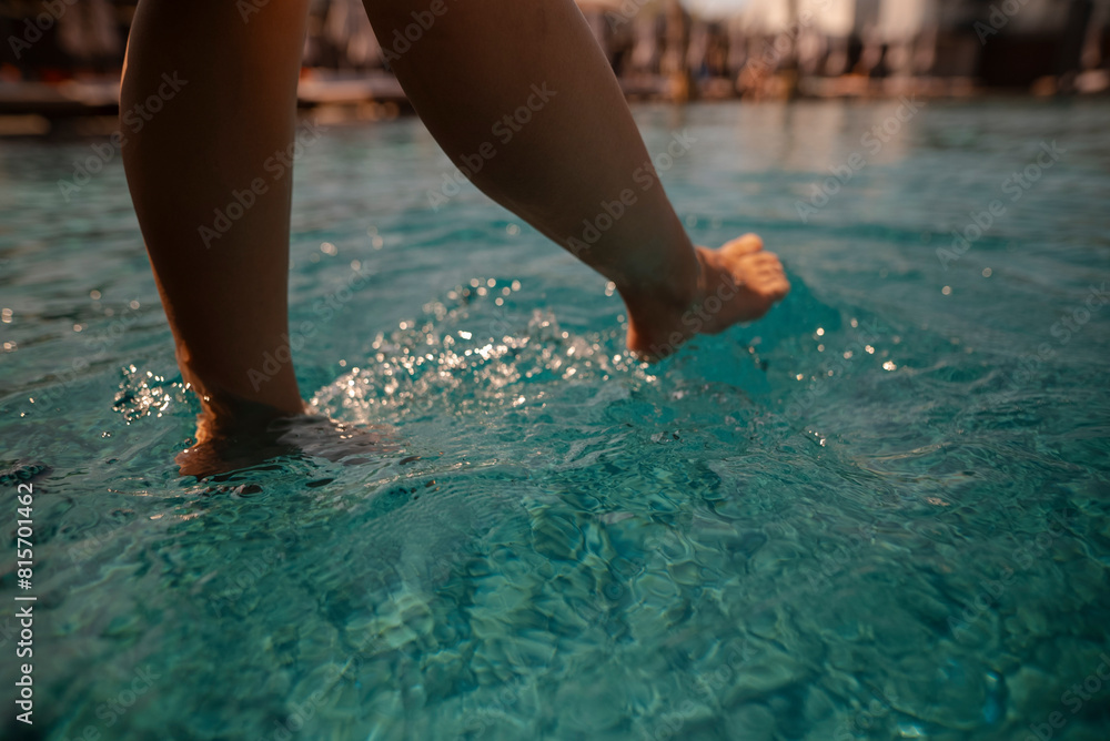 A captivating girl in a bathing suit sits by the pool, her back against the edge.