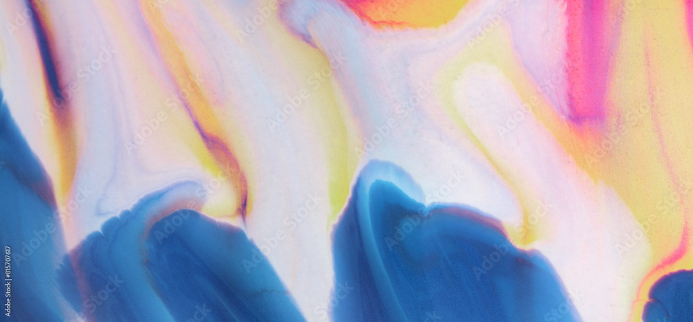 Vibrant acrylic paint flowing downwards on a surface, creating a colorful and dynamic abstract pattern.