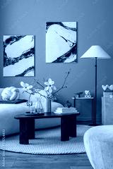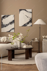 Spring living room interior with mock up poster frame, wooden coffee table, boucle sofa, round carpet, stylish lamp, sculpture, vase with magnolia and personal accessories. Home decor. Template.