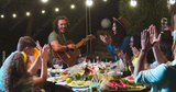 Joyful mixed-race young people having fun at party in garden at summer evening. Happy Caucasian male playing the guitar and singing outdoor. African American and Asian girls applaud. Leisure concept
