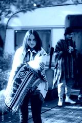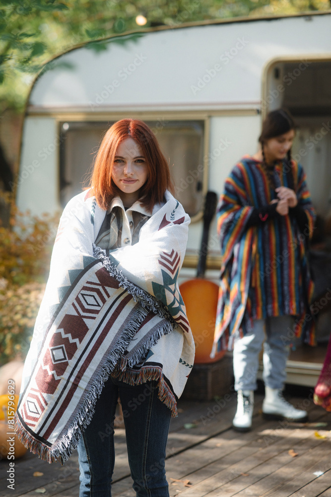 A charming girl flaunts her boho-chic style against the serene park setting, with a trailer in view.