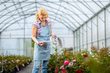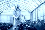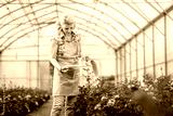 Women working in the flower greenhouse selecting roses for pollination to create a new variety.