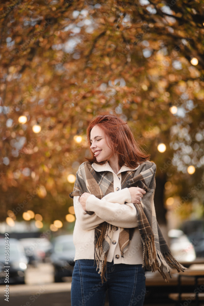 A lively redhead grins with delight, spreading warmth on the autumn streets.