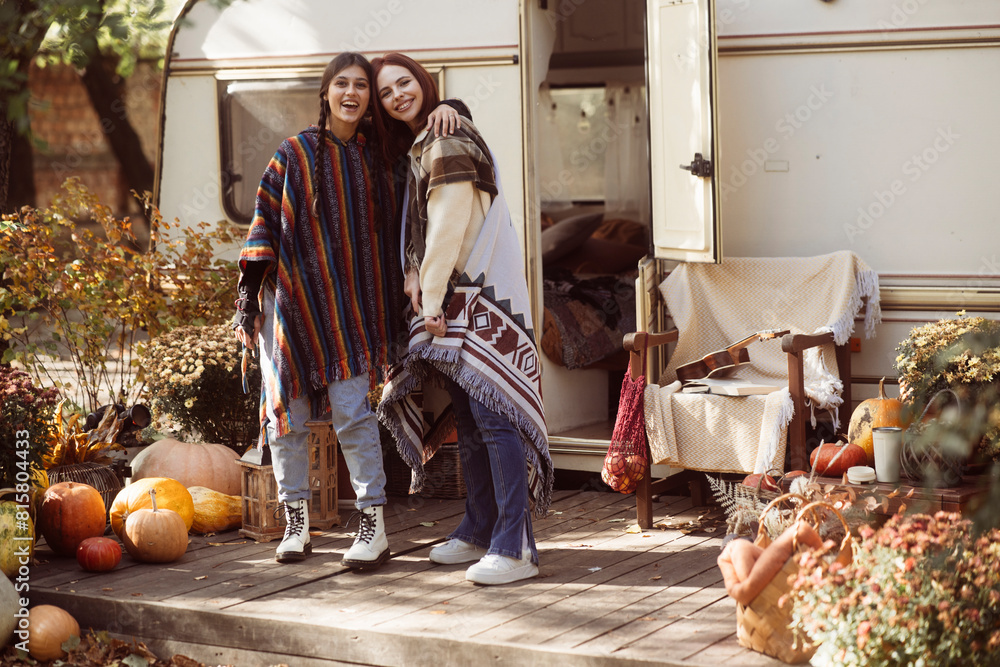 A pair of fashionable young women rock bohemian looks in front of a trailer.